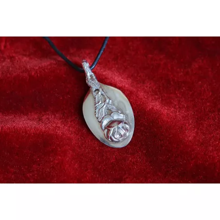 Kettenamulett gearbeitet aus einem Mokkalöffel Design "Hildesheimer Röschen", mit Lederband. Silber-Auflage