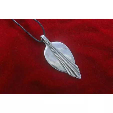 Kettenamulett gearbeitet aus einem Kaffeelöffelchen mit dem beliebten Fächer-Muster, incl. Lederband. Silber-Auflage