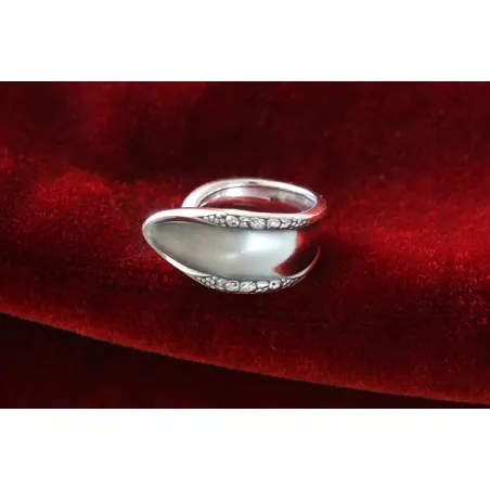 Ein Besteck - Ring gefertigt aus dem Stielende eines Teelöffels - ein spitzes Stiel-Ende mit schlichtem Dekor. Silber-Auflage